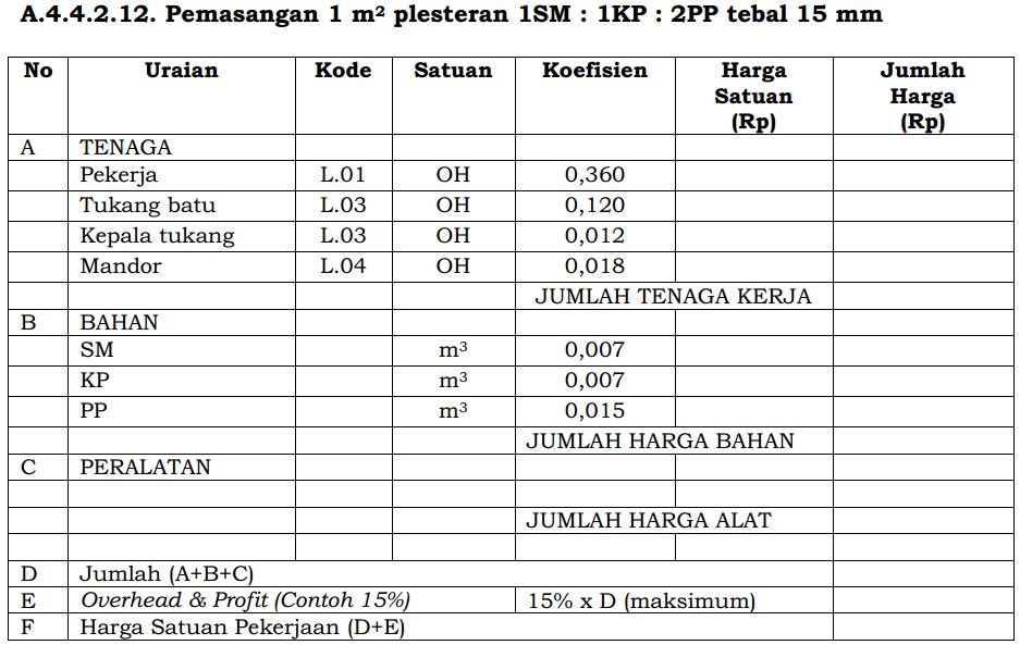 HomeAHSP PEKERJAAN PLESTERAN A.4.4.2.12. Pemasangan 1 m2 plesteran 1SM : 1KP : 2PP tebal 15 mm byNauTwo -12:55 AM 0 PERATURAN MENTERI PEKERJAAN UMUM DAN PERUMAHAN RAKYAT REPUBLIK INDONESIA NOMOR 28/PRT/M/2016 TENTANG PEDOMAN ANALISIS HARGA SATUAN PEKERJAAN BIDANG PEKERJAAN UMUM ANALISIS HARGA SATUAN PEKERJAAN (AHSP) BIDANG CIPTA KARYA