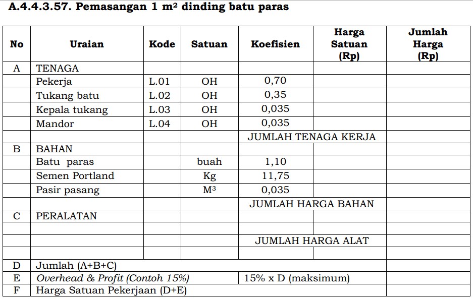HomeAHSP PEKERJAAN PENUTUP LANTAI DAN PENUTUP DINDING A.4.4.3.57. Pemasangan 1 m2 dinding batu paras byNauTwo -5:44 AM 0 PERATURAN MENTERI PEKERJAAN UMUM DAN PERUMAHAN RAKYAT REPUBLIK INDONESIA NOMOR 28/PRT/M/2016 TENTANG PEDOMAN ANALISIS HARGA SATUAN PEKERJAAN BIDANG PEKERJAAN UMUM ANALISIS HARGA SATUAN PEKERJAAN (AHSP) BIDANG CIPTA KARYA