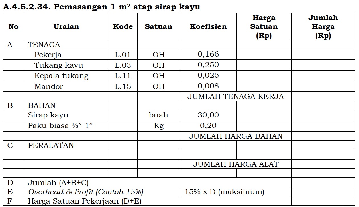 HomeAHSP PEKERJAAN LANGIT-LANGIT (PLAFOND) A.4.5.2.34. Pemasangan 1 m2 atap sirap kayu byAdmin -11:58 PM 0 PERATURAN MENTERI PEKERJAAN UMUM DAN PERUMAHAN RAKYAT REPUBLIK INDONESIA NOMOR 28/PRT/M/2016 TENTANG PEDOMAN ANALISIS HARGA SATUAN PEKERJAAN BIDANG PEKERJAAN UMUM ANALISIS HARGA SATUAN PEKERJAAN (AHSP) BIDANG CIPTA KARYA