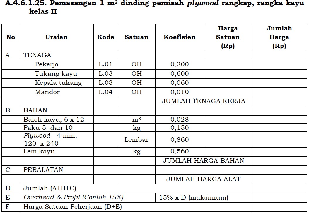 A.4.6.1.25. Pemasangan 1 m2 dinding pemisah plywood rangkap, rangka kayu kelas II