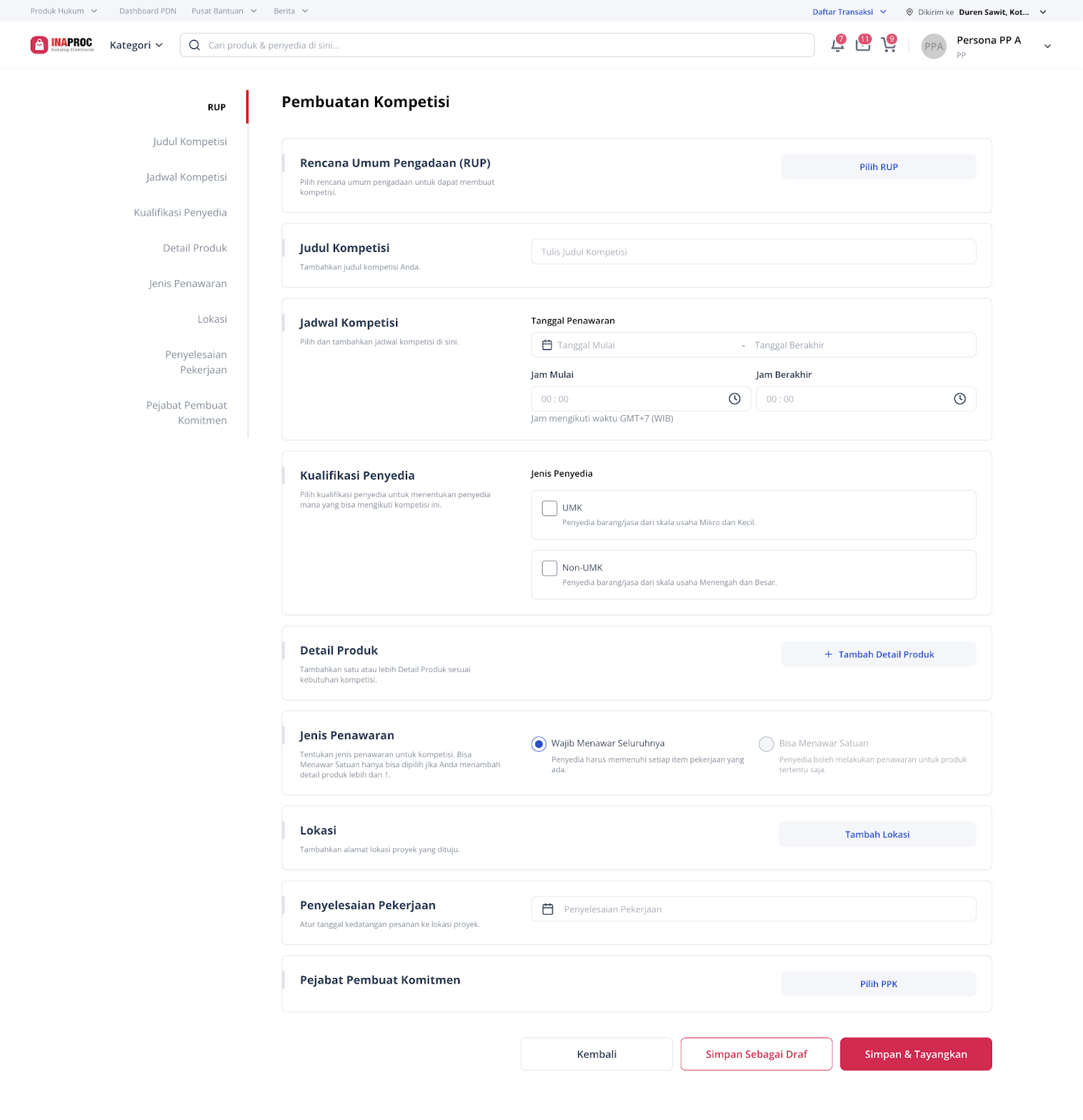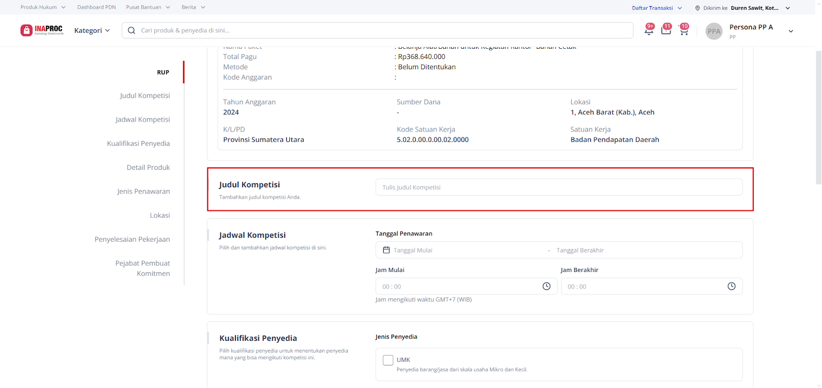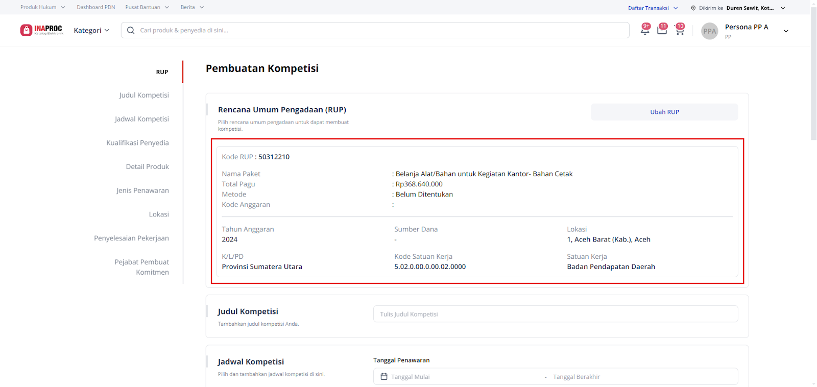 Selanjutnya, PPK/PP akan kembali ke halaman pembuatan kompetisi dengan detail RUP yang telah berhasil dipilih.