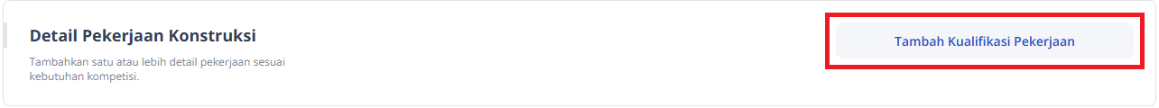 Selanjutnya PPK/PP dapat menambahkan satu atau lebih item pekerjaan konstruksi sesuai dengan kebutuhan kompetisi yang akan dibuat. PPK/PP dapat menekan menu “Tambah Kualifikasi Pekerjaan” untuk dapat menambahkan detail pekerjaan yang dibutuhkan.