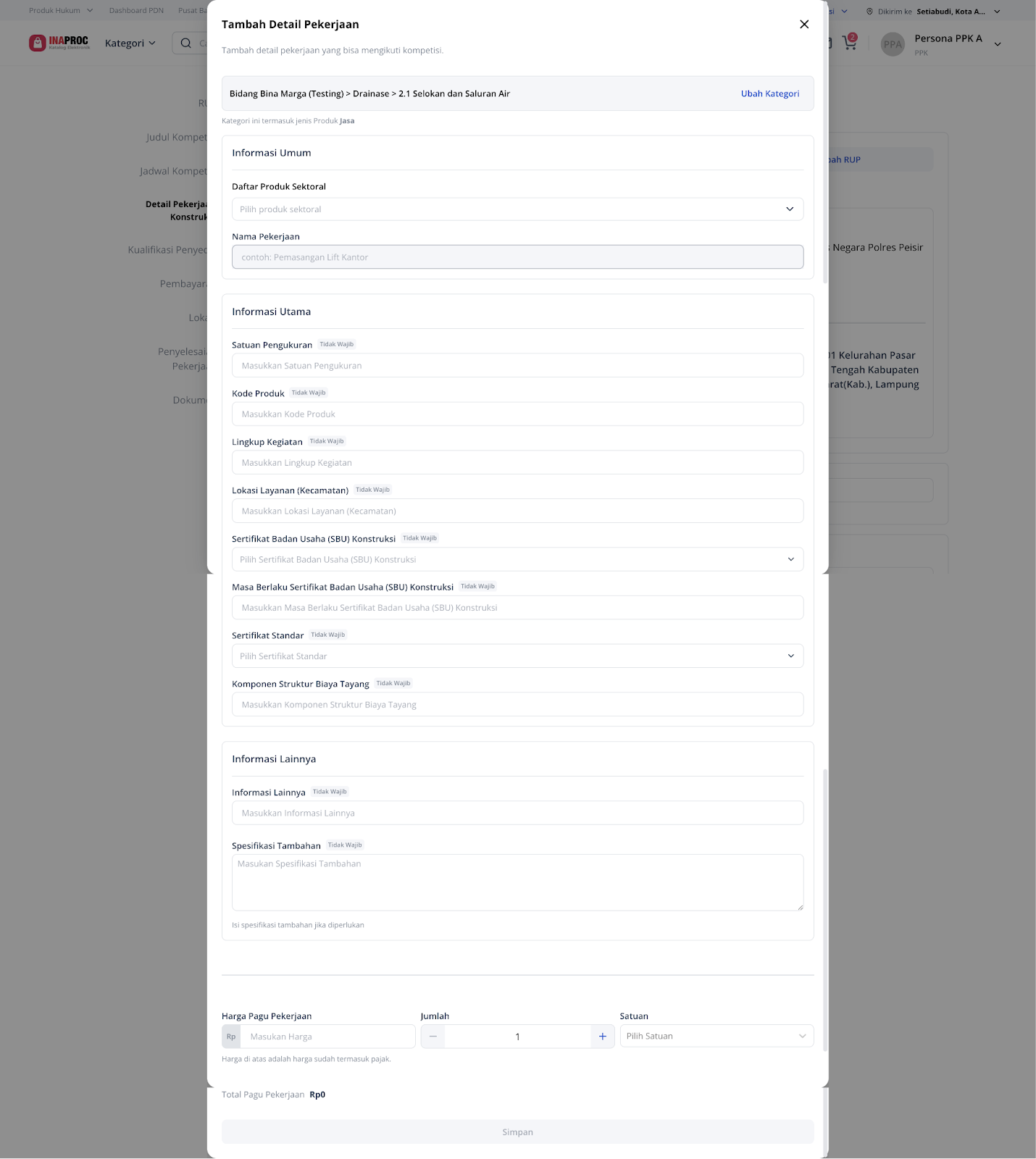 Pada halaman tambah detail pekerjaan ada beberapa bagian yang harus diisi oleh PPK/PP. Pada Informasi Umum, PPK/PP perlu mengisi Informasi Umum yang terdiri dari Daftar Nama produk Sektoral dan nama pekerjaan. Selanjutnya PPK/PP dapat mengisi tentang informasi utama tentang jasa dan pekerjaan konstruksi. Untuk informasi utama dan informasi lainnya sifatnya “Tidak Wajib”, menyesuaikan kebutuhan kompetisi yang akan dibuat. Namun pada tahap ini PPK/PP harus melakukan pengisian harga pagu per produk, satuan produk, serta kuantitas produk (belum dalam bentuk desimal) untuk dapat menyimpan detail produk yang akan dikompetisikan.