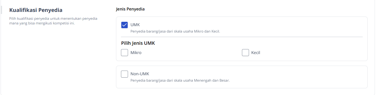 Jenis kualifikasi ini mencakup penyedia barang dan jasa dari skala usaha mikro dan kecil. Dengan nilai total pagu kompetisi sampai dengan Rp15.000.000.000,00 (lima belas miliar rupiah) diperuntukan bagi Usaha Mikro, Usaha Kecil atau Koperasi. Namun, apabila paket tersebut menuntut kemampuan teknis yang tidak dapat dipenuhi oleh Usaha Mikro, Usaha Kecil atau Koperasi maka dapat diperuntukan bagi penyedia Non Usaha Mikro, Usaha Kecil atau Koperasi.