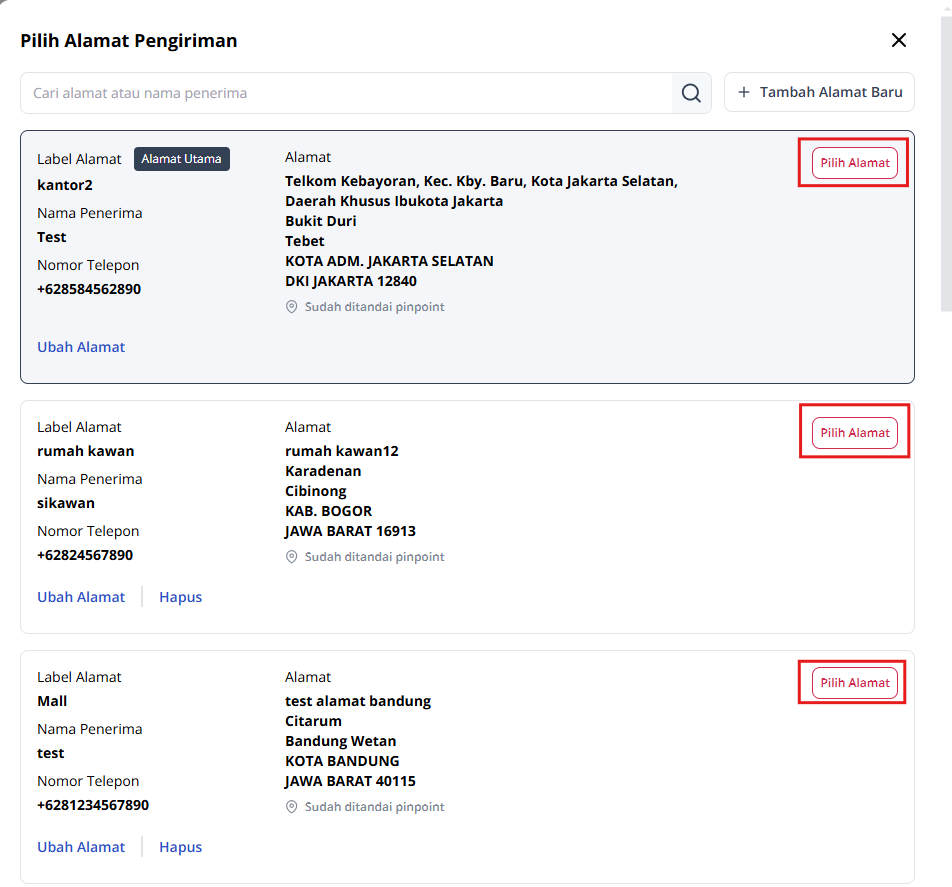 Selanjutnya akan masuk ke halaman pilih alamat pengiriman. Apabila alamat pengiriman sudah pernah didaftarkan sebelumnya, maka PPK/PP dapat memilih sesuai dengan daftar alamat pada halaman tersebut.