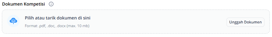 Langkah pertama yang harus dilakukan adalah mengunggah Dokumen Kompetisi. Sebelum mengunggah dokumen kompetisi, PPK/PP yang membuat kompetisi diharuskan untuk memastikan dokumen yang akan diunggah sudah memuat Detail Engineering Design (DED). PPK/PP menekan opsi “Unggah Dokumen”. Format file yang diunggah adalah .PDF, .doc, .docx dengan ukuran maksimal 10 MB.