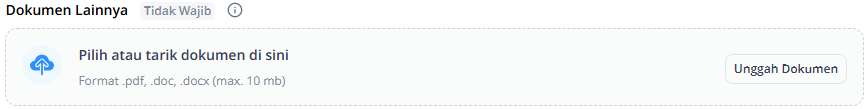 Selanjutnya PPK/PP dapat mengunggah dokumen-dokumen pendukung lainnya. Pada proses unggah dokumen lainnya ini perlu diperhatikan, bahwa penyedia dapat melihat dokumen-dokumen yang diunggah ini selama masa penawaran. Sehingga disarankan untuk tidak mengunggah dokumen sensitif seperti dokumen Rencana Anggaran Biaya (RAB) dan lainnya. Format file yang diunggah adalah .PDF, .doc, .docx dengan ukuran maksimal 10 MB.