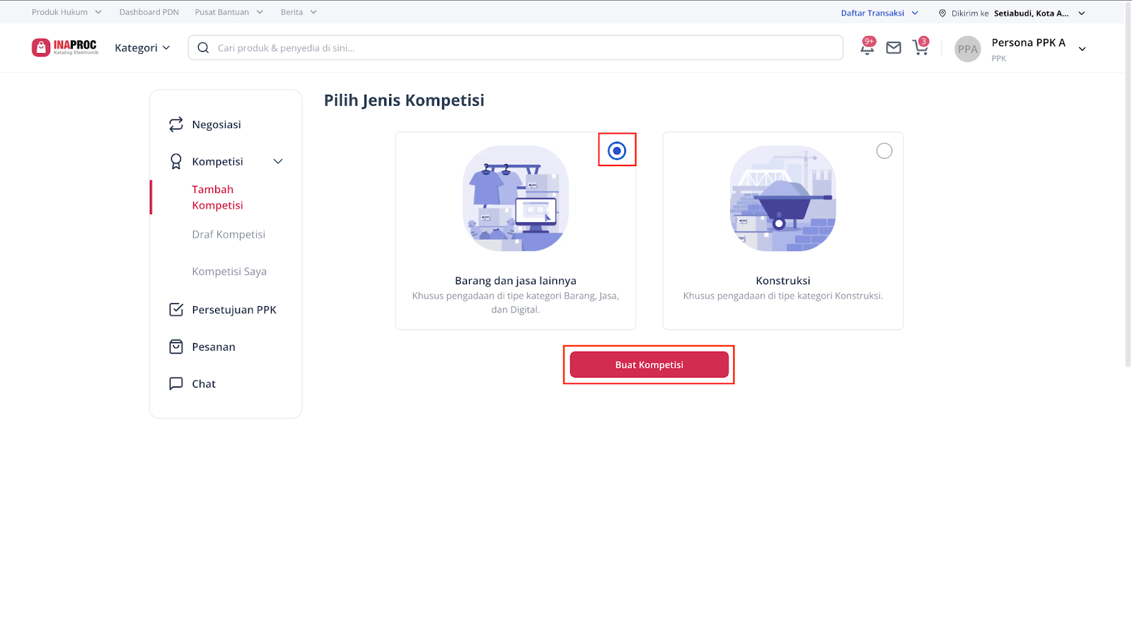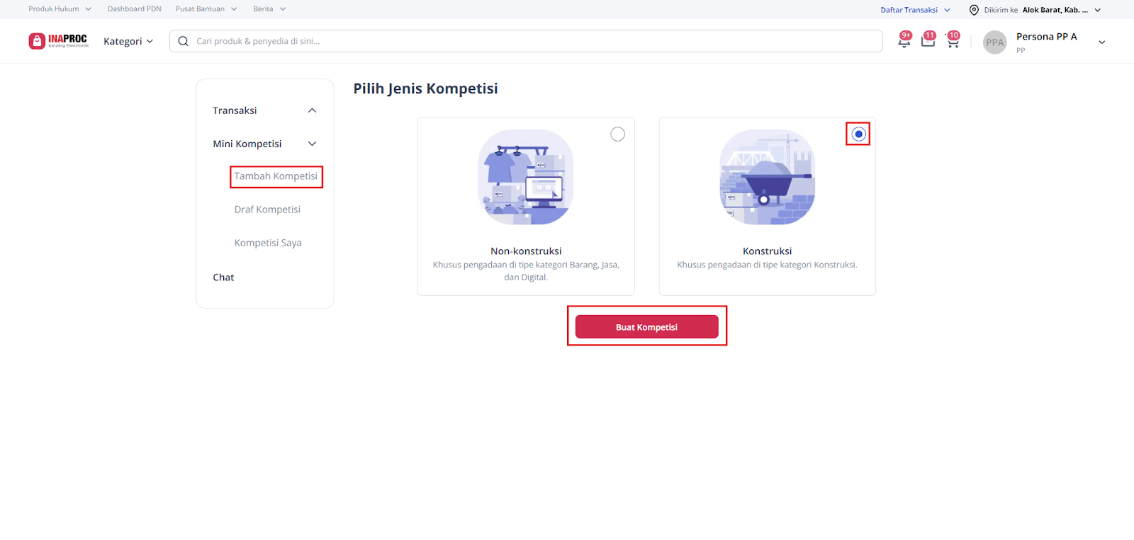 PPK/PP akan melanjutkan proses pembuatan mini-kompetisi dengan memilih jenis kompetisi non Konstruksi, PPK/PP harus memastikan bahwa pengadaan ini diperuntukkan untuk kategori barang, jasa, dan/atau digital.