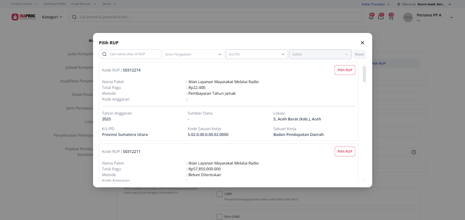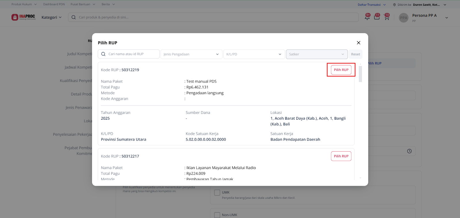Setelah menemukan RUP yang sesuai, selanjutnya PPK/PP dapat menekan tombol “Pilih RUP”.