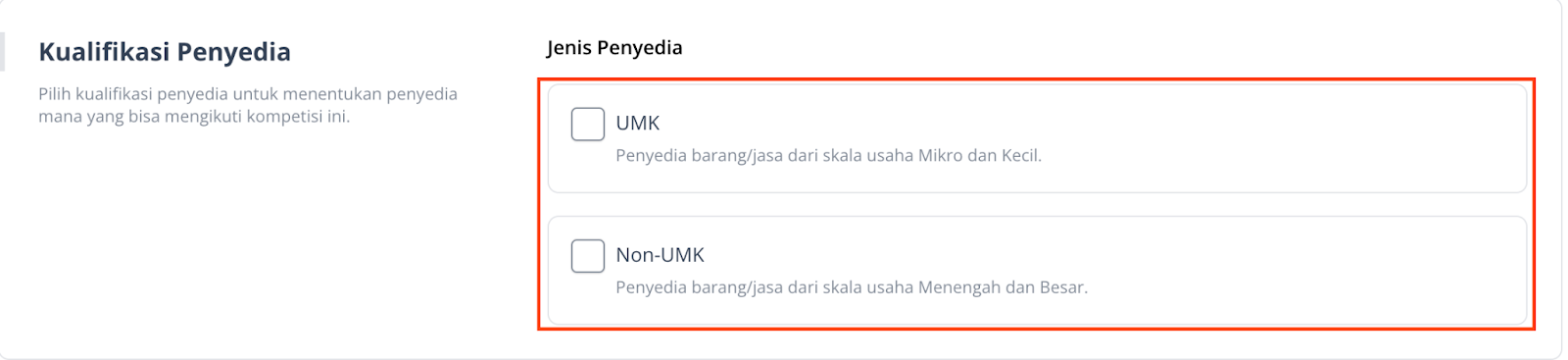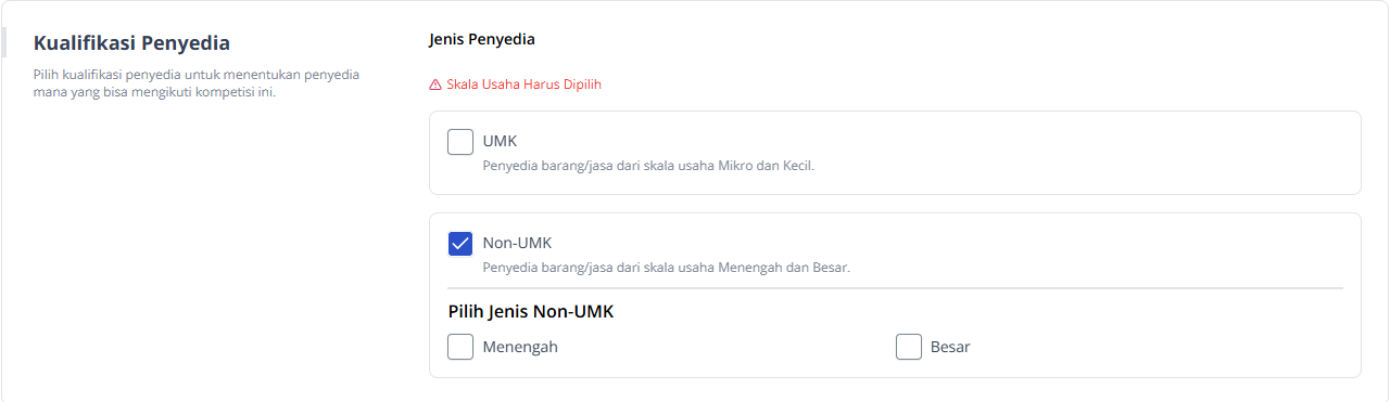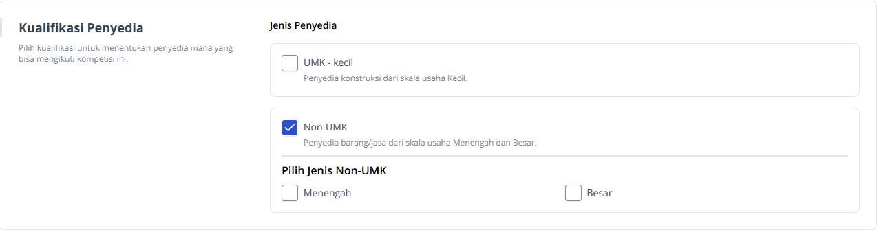 Jenis kualifikasi ini berlaku untuk penyedia barang dan jasa dari skala usaha menengah dan besar/Non-UMK. Nilai total pagu kompetisi dengan nilai di atas Rp 15.000.000.000,00 (lima belas miliar rupiah) diperuntukan bagi Non Usaha Mikro, Non Usaha Kecil atau Non Koperasi.