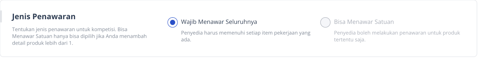 Langkah selanjutnya dalam proses pembuatan mini-kompetisi ini, PPK/PP memilih jenis penawaran yang diperbolehkan dalam kompetisi yang dibuat. Terdapat dua jenis penawaran yang dapat dipilih oleh PPK/PP, yaitu:
