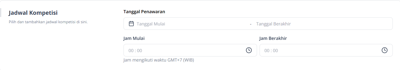 Diikuti dengan jam dimulai dan jam berakhirnya penawaran tersebut. Diwajibkan untuk mengklik “Simpan” pada saat pemilihan jam untuk jadwal kompetisi dikarenakan jika tidak maka pilihan jadwal tersebut akan hilang dan kembali ke pengaturan awal.