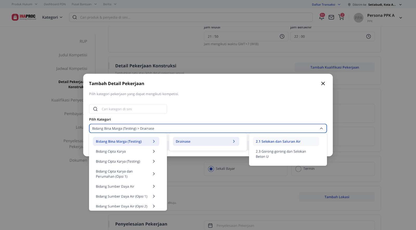 Setelah memilih opsi tambah kualifikasi, maka PPK/PP akan diarahkan pada halaman tambah detail pekerjaan. Selanjutnya PPK/ PP dapat memilih kategori pekerjaan yang dapat mengikuti kompetisi. Perlu diperhatikan, kategori yang digunakan pada pekerjaan konstruksi ini adalah Kategori Jasa Konstruksi serta Pekerjaan Konstruksi. Jika PPK/PP ingin membuat kompetisi Barang Material dan Peralatan, maka Silakan pilih “Mini-Kompetisi Barang dan Jasa Lainnya”. PPK/PP dapat langsung melakukan pencarian kategori pada kolom pencarian, atau dapat langsung pada opsi pilih kategori.
